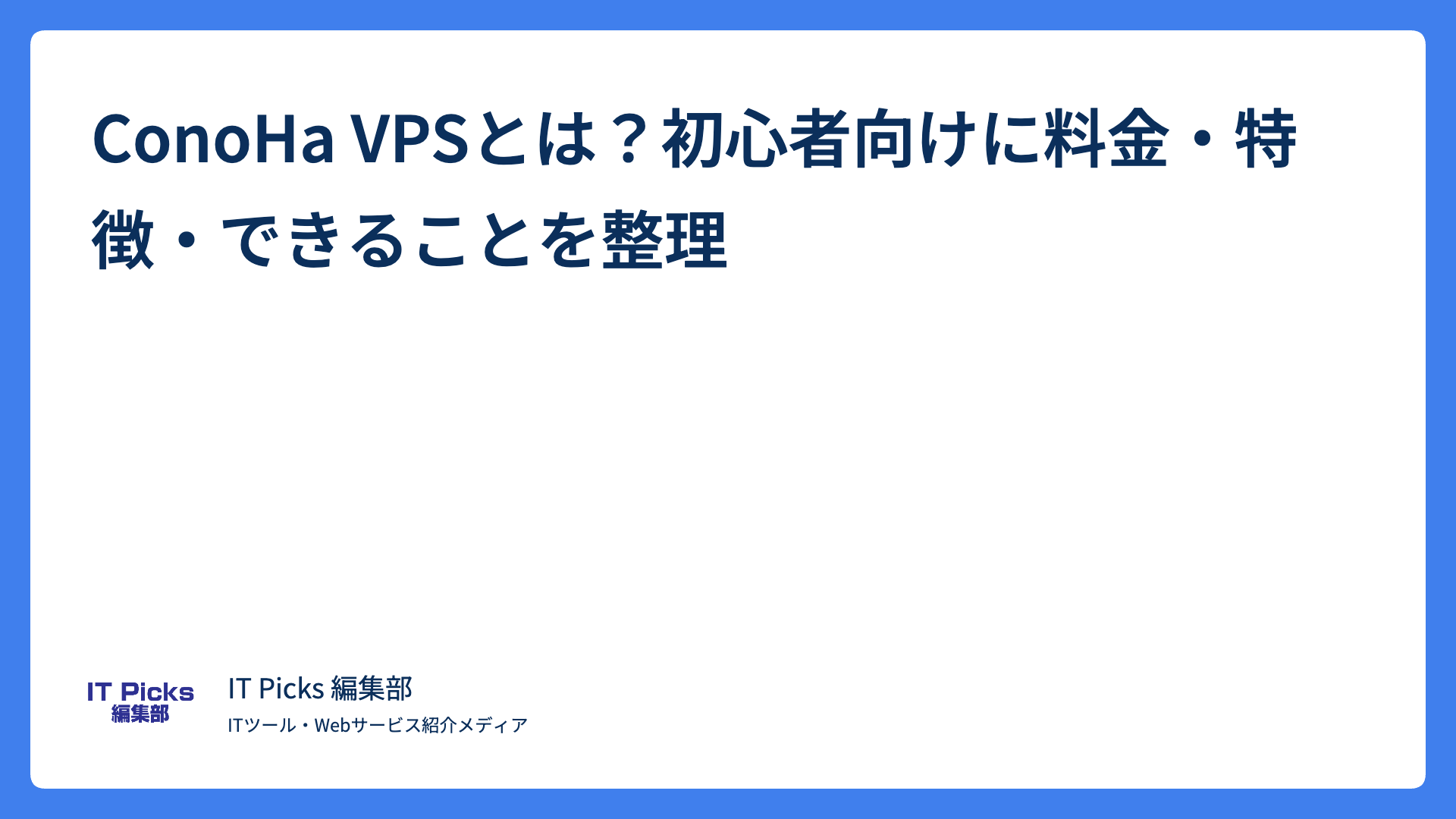 ConoHa VPSとは?初心者向けに料金・特徴・できることを整理 2026.01.08 Webサービス itpicks_admin IT Picks 【2026年版】VPSおすすめの選び方|失敗しやすいポイントと候補まとめ 2026.01.08 比較・まとめ itpicks_admin IT Picks