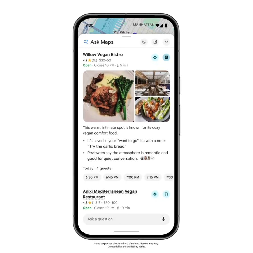 Ask Mapsの回答は、ユーザーの過去の検索・保存・訪問履歴をもとにパーソナライズされます。 たとえばヴィーガン料理をよく検索するユーザーには、明示的に言わなくてもヴィーガン対応の店が優先的に提案される仕組みです。