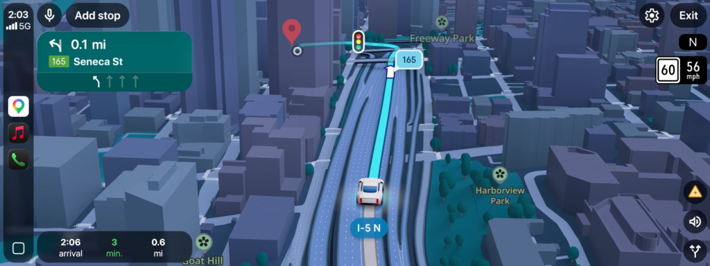 従来の2D表示からフォトリアルな3D表示に変わり、これまでの青い矢印だけの案内から、車線・横断歩道・信号・一時停止標識といった道路の詳細情報がリアルタイムで画面に表示されます。