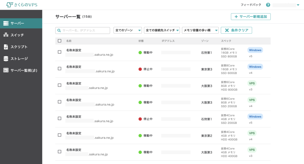 スイッチ機能を使って複数台構成を組む場合は、各サーバーに2G以上を割り当てておくと安心です。 WebサーバーとDBサーバーを分けた最小構成なら、2G×2台(石狩・年額払い)が最もコスパが良い組み合わせです。