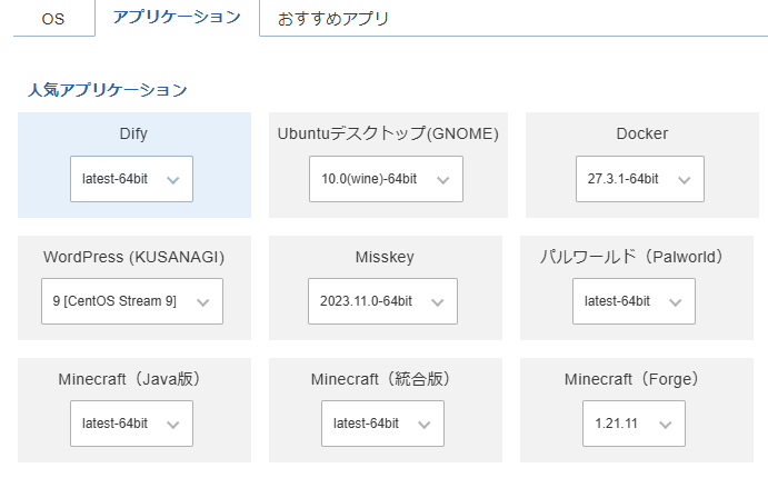 ただ、ConoHa VPSに比べるとアプリテンプレートの種類がやや少なめです。 ConoHaは35種類以上のテンプレートがありますが、Xserver VPSは現時点では対応イメージが絞られています(WordPress・LAMP・Docker・KUSANAGI・Minecraft・Difyなど)。