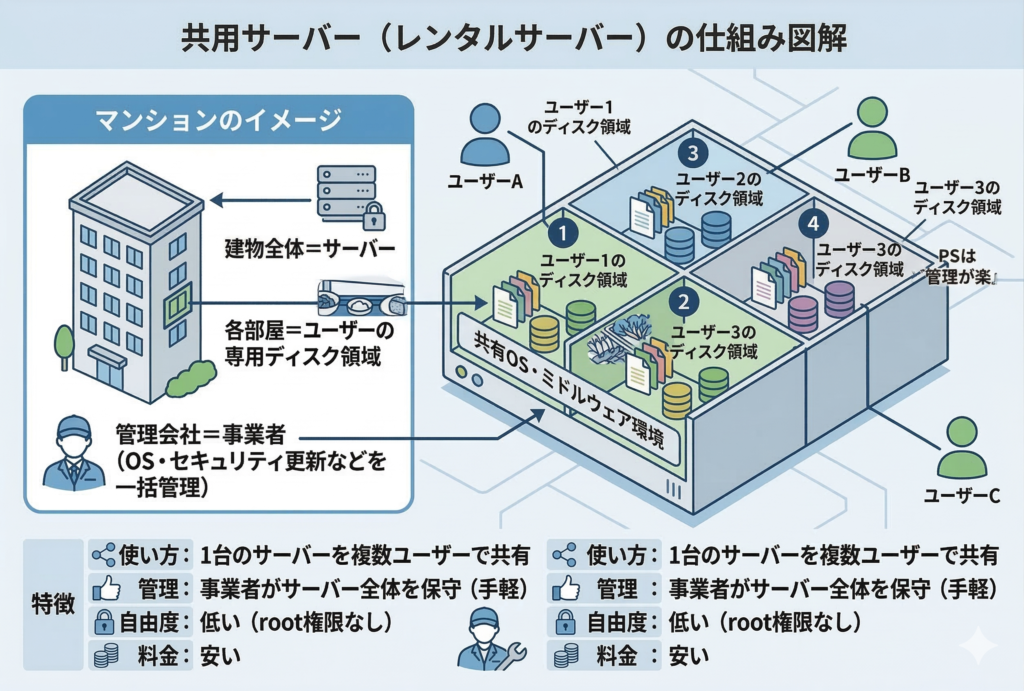 | 共用サーバー(レンタルサーバー) | 複数ユーザーでサーバーを共有する |