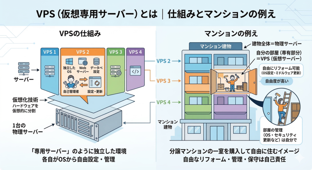 先ほどのマンションに例えると、VPSは「分譲マンションの一室を購入して自由にリフォームできる」に近いです。建物は共有ですが、自分の部屋(仮想サーバー)の中は自由に手を加えられます。ただし、部屋の管理(OS・ミドルウェアの設定・更新)は自分でやる必要があります。